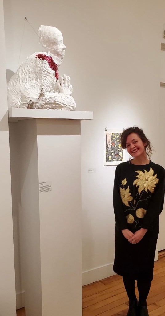 This sculpture represents the reincarnation of Saint Christina the Astonishing, a woman who died of an epileptic seizure, but during the funeral service levitated up to the rafters. Using plaster, the sculpture explores gestures of jerks, jolts, starts, and stops, asking for both grace and tension, mourning and happiness, fluidity and brokenness, life and death. The sculpture moves with the artist’s own body, bringing it from Christina, who lived in 12th century Belgium, to Maria, who lives in 21st century New York City. Through their epileptic gestures, prayer, and the possibility of blank spaces, Maria, epileptic and unwell artist, and Christina, Saint of epilepsy and mental illness maybe come together, cripping time, space, worlds. Christina was shown as part of an Advanced Studio Works show in Macy Gallery at Teachers College, Columbia University in Spring of 2024.