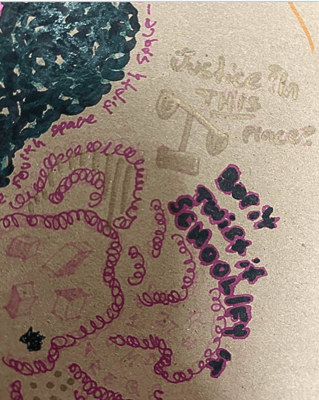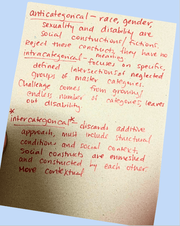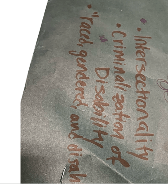 his is a painting of a pink figure with pink eyes, sitting, painted by a student during a class session of C&T4000, Summer 2025.[This is a line drawing of two figures with pig tails, drawn on paper during a class session of C&T4000, Summer 2025][Handwritten words: “It felt funny to struggle to watch a video about ADHD in a room full of people watching videos at the same time. (I have ADHD)” by a student during a class of C&T4000, Summer, 2025[painted doodles of a car, an angry figure on a “normal” curve, a figure skateboarding, and colors, painted by students during C&T4000, Summer 2025][This is a photograph taken of brown paper with doodles and paintings on it. Winding words read: “fourth space, fifth space” and gold, handwritten letters read: “Justice in THIS place?”][a piece of brown paper with handwritten words: “anticategorical- race, gender, sexuality and disability are social constructions/fictions. Reject these constructions/fictions. They have no meaning. Intracategorical- focuses on specific, defined intersections of neglected groups of master categories. Challenge comes from growing endless number of categories, leaves out disability. **Intercategorical**- discards additive approach, must include structural conditions and social context. Social constructs are enmeshed and constructed by each other. More contextual.][writing on piece of brown paper amongs doodles: “Disability studies- how we got here. Disability justice- where we’re going/can go.”][writing in marker on green paper: “-intersectionality -criminalization of disability -race, gendered, and disabled” ][jumbled handwriting that reads: LABELS. Capitalist, societies. “It was 2019 and everybody was finally equal…” Who benefits??” ][writing in green crayon that says: Who gets to speak about this? NOT THE POOR!][sketch of a “normal” curve, made by a student during class session of C&T4000, Summer 2025[floating abstract figures, drawn by student[s] in C&T 4000, Summer 2025][intricate doodles,, drawn and painted by student[s] in C&T 4000, Summer 2025[swaths of paint in various colors, painted by student[s] in C&T 4000, Summer 2025][intricate and multicolored painting- two figures surrounded by stenciled leaves, enclosed in painters tape. Made by Maddie McNally in C&T 4000, Summer 2025]