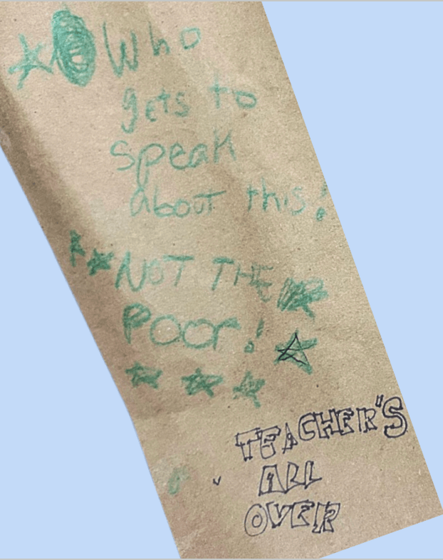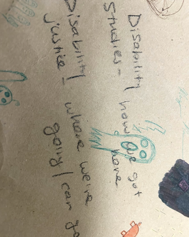 Our summer course of Disability, Exclusion, and Schooling took place twice a week as a lecture-style seminar. The tables were covered in brown paper and students were given markers, crayons, paint, and other tools to doodle, think, and take notes. Each week, we added more marks to the same paper, layering thought, feeling, and concepts over and through each other. At the end, we made a book out of everything we had amassed. Here are some snapshots from our scribbles/collective thinking.